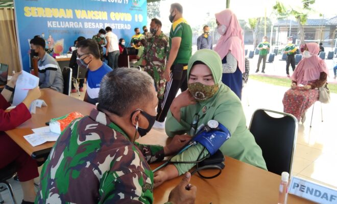 JAKARTA, – Komandan Pusat Teritorial TNI Angkatan Darat, Letnan Jenderal TNI Teguh Arief Indratmoko, S.E., M.M mengecek dan memantau langsung kegiatan Serbuan Vaksinasi Covid-19 di Lapangan Volly Markas Pusterad Cipayung Jakarta Tmur. Yang sebelumnya Danpusterad telah memerintahkan jajarannya untuk menyelenggarakan kegiatan Vaksin Covid-19 bagi anggota dan keluarganya dalam rangka percepatan Vaksinasi Covid-19 di lingkungan TNI AD. Kegiatan yang dilaksanakan pada Senin, 12 Juli 2021 ini telah melibatkan 217 Peserta penerima Vaksin dari Keluarga Besar Pusterad. Kegiatan ini diselenggarakan oleh Staf Direktur Umum Pusterad bekerja sama Rumah Sakit Cijantung Kodamjaya dan Persit Kartika Chandra Kirana PCBS Pusterad.